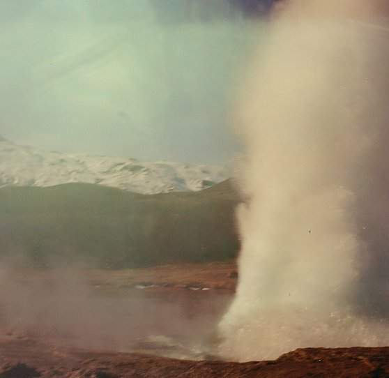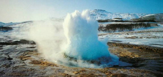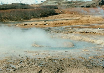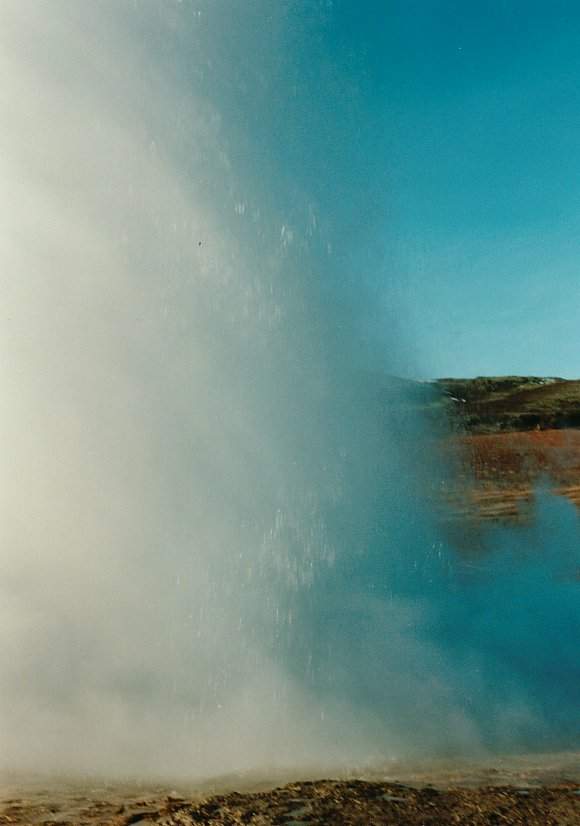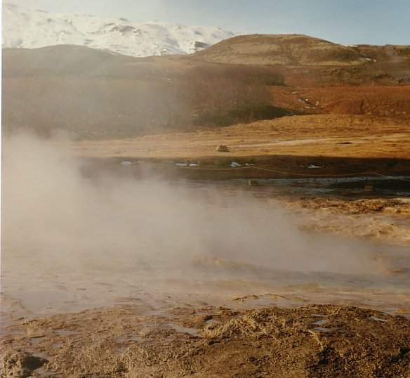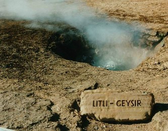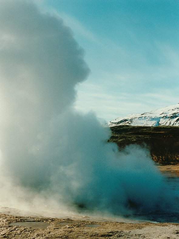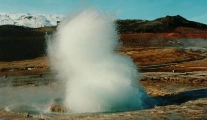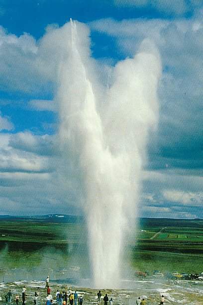 Der Geysir, von dem die Springquellen in aller Welt ihren Namen haben, entspringt in einem Becken von 18 m Durchmesser. Die Quelle ist allerdings aus eigener Kraft zu großen Sprüngen nicht mehr geneigt, läßt sich aber zu besonderen Anlässen mit sehr großen Mengen Schmierseife zu einem Ausbruch reizen. Die Umweltschützer haben aber inzwischen erreicht, daß dieses wegen der Grundwasserverschmutzung, auch bei Staatsbesuchen nicht mehr erlaubt wird. Bis zu 70 m kochendes Wasser schleuderte dieser Geysir in die Luft ! |