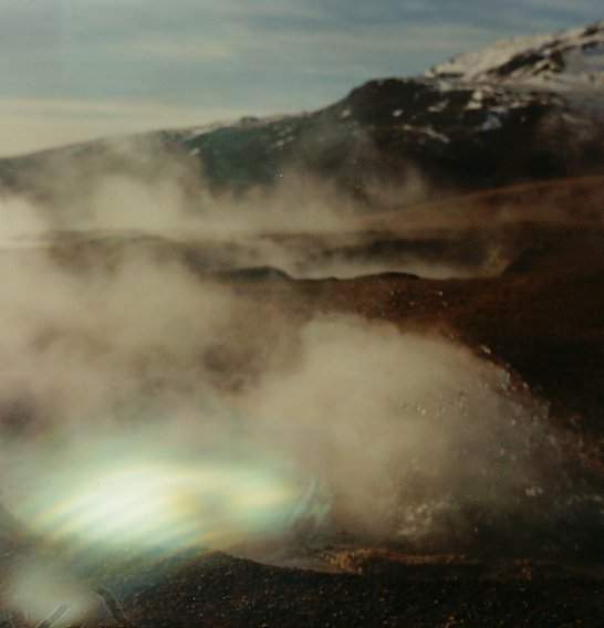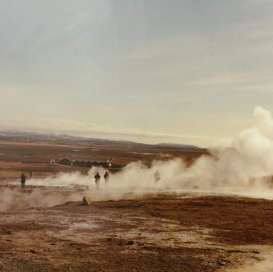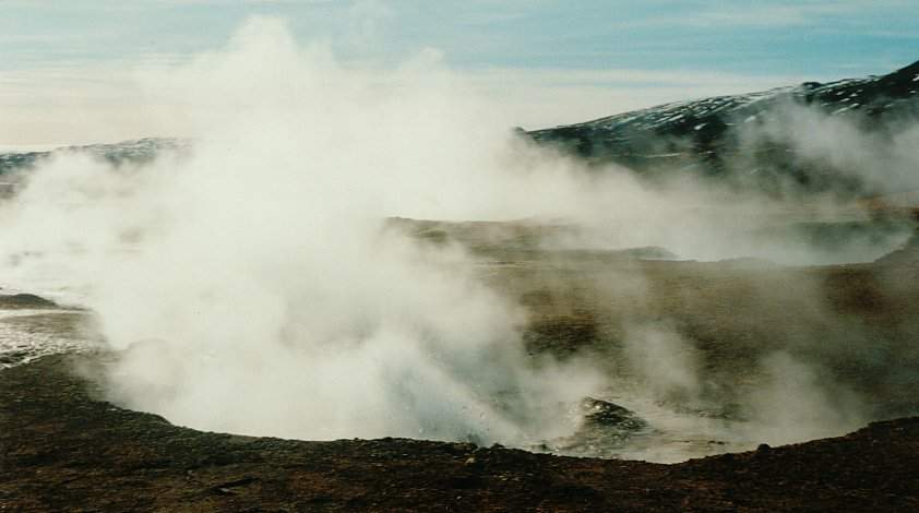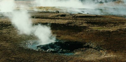 | Die Fahrt geht weiter zum großen Geysirgebiet. Von weitem sieht man schon die Dampfsäulen der heißen Quellen. |