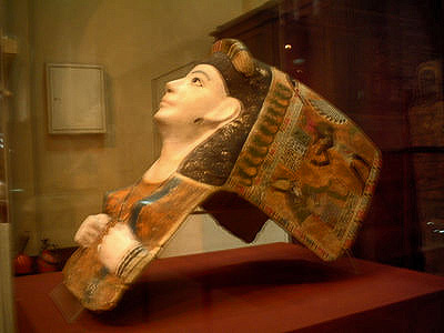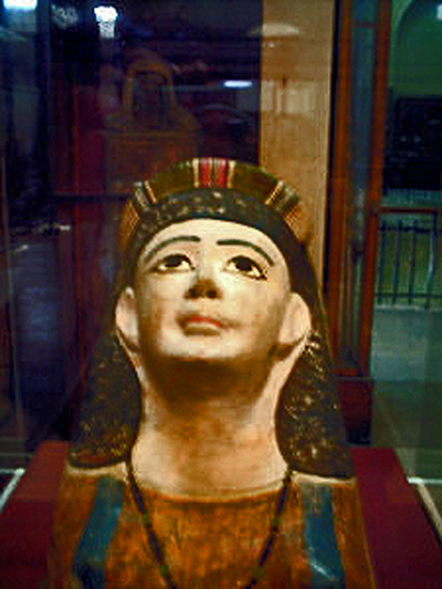 In römischer Zeit wurden die Mumiensärge über einer Form aus gesteifter Leinwand oder Papyrus aus Stuck modelliert. Sie zeigen die Tracht der Zeit. Die Köpfe wurden serienmäßig in Modeln geformt und in ihrer Endausführung durch Bemalung variiert.
