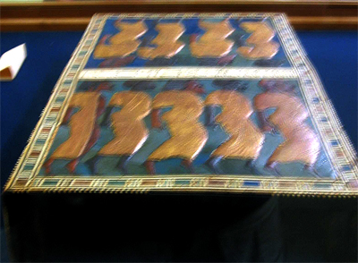 Zum Thron des Tutanchamuns gehört auch dieser Schemel, auf welchem die neun Bögen, der ägyptische Name für die traditionellen Feinde von Ägypten, abgebildet ist. Die sorgfältig in Handarbeit gemachten Abbildungen auf dem Schemel, zeigen neun Afrikaner und Asiaten, die zusammen mit Ketten gebunden sind. Jeder trägt Kleidung und Ausrüstung und wird mit den Eigenschaften abgebildet, die den unterschiedlichen Völkern eigen ist. Sie wurden auf dem Schemel in Position gebracht, damit der Pharao, wenn er auf seinem Thron saß, seine Feinde unter seinen Füßen zertreten kann. Der Schemel des Königs hat die Form eines kleinen, niedrigen, rechteckigen Kasten.