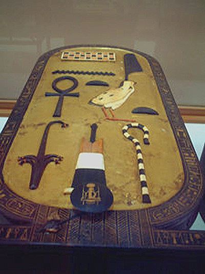 Die Truhe, eine kastenförmige Holzkiste, in Form einer Königskartusche trägt in übergroßen Hieroglyphen den Geburtsnamen des Königs Tutanchamun auf der Deckeloberfläche.