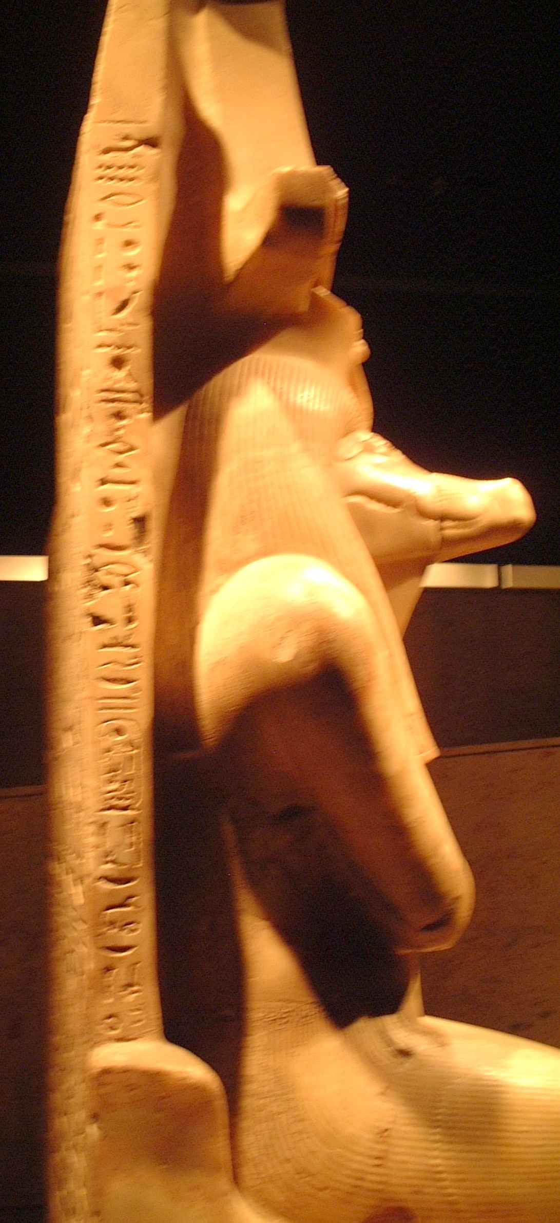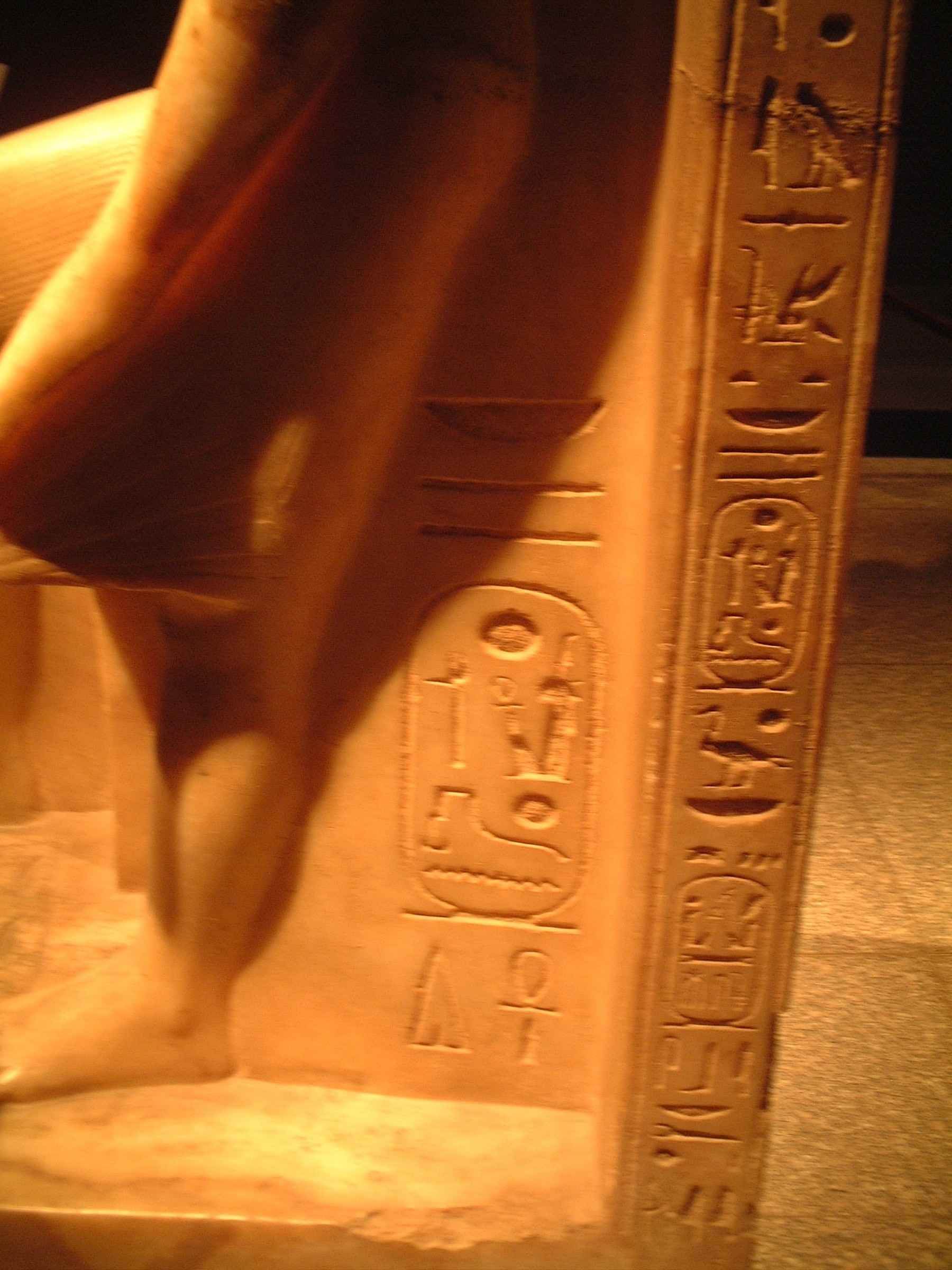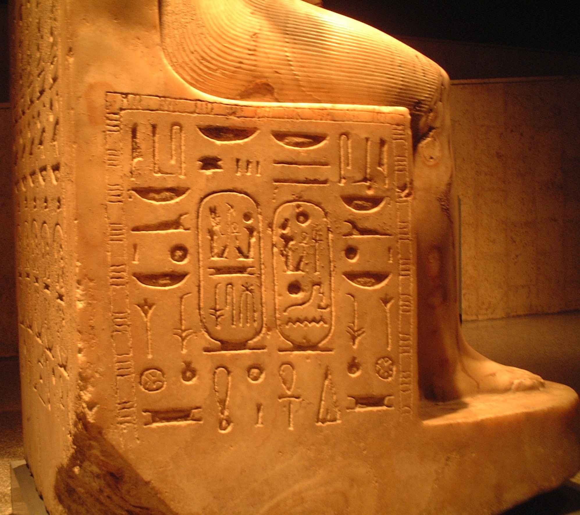 Die Rückseite der Skulptur zeigt vertikale Inschriften in Hieroglyphen mit dem Königsnamen und seinen Titeln.