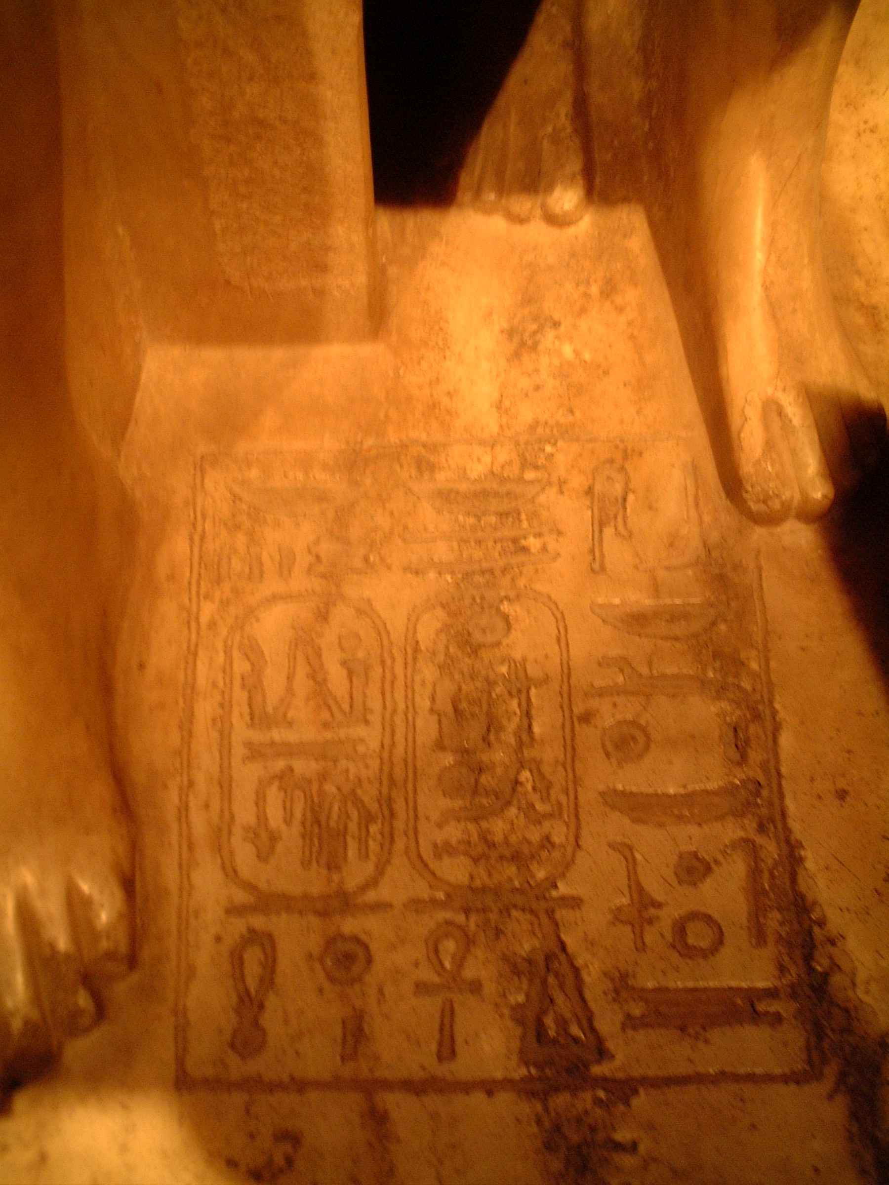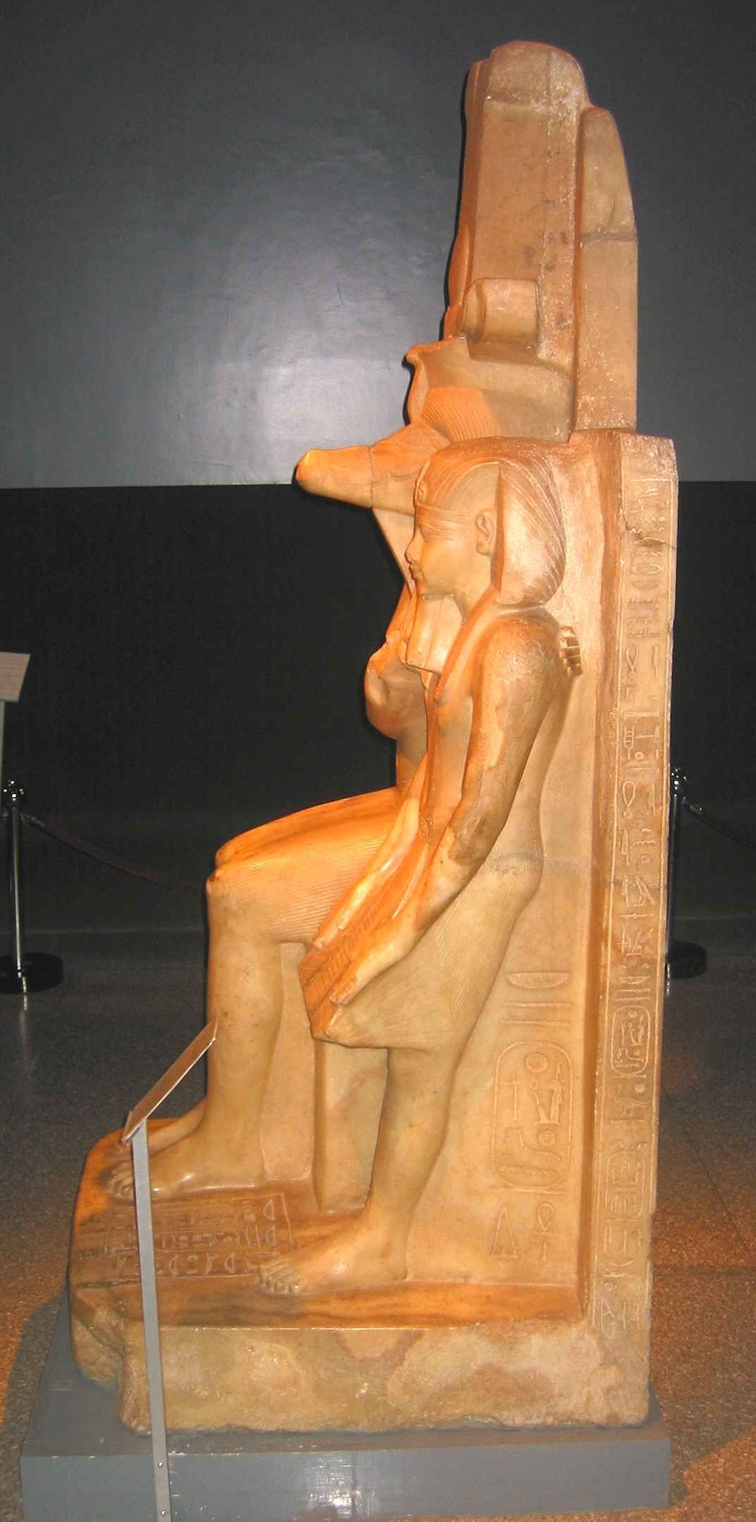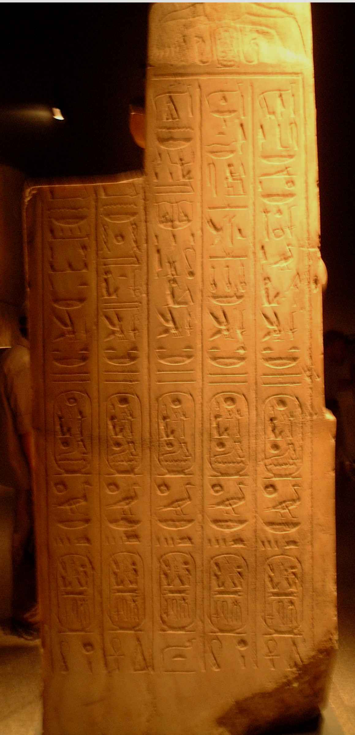 Die Rückseite der Skulptur zeigt vertikale Inschriften in Hieroglyphen mit dem Königsnamen und seinen Titeln.