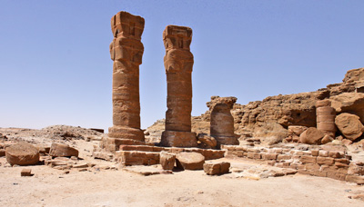 Hathorkapitellen sind zwei erhalten geblieben und wieder aufgerichtet