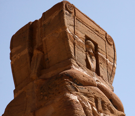 Eine Nahaufnahme aus einem anderen Blickwinkel der Hathorkapitellen mit einem Naos auf dem Kopf, in dem sich eine Kobra mit Sonnenscheibe auf dem Haupt befindet. |