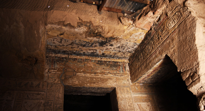 Zentralsanktuar. Der Architrav ist nach ägyptischem Stil mit einer geflügelten Sonnenscheibe dekoriert. Seitlich befinden sich Inschriftenzeilen. |