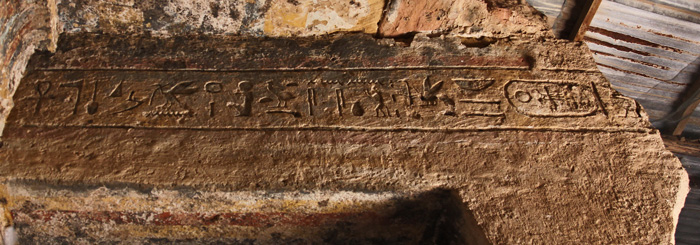 Text des Architravs: anx nTr nfr qmA n Ra wtT n xmn.jw nj-sw.t-bj.tj nb tA.wj (Nfrtm-xwj-Ra)| sA [Ra ...] "Es möge leben der gute Gott, geschaffen von Re, erzeugt von der Achtheit, König von Ober- und Unterägypten, Herr der beiden Länder Nefertem-chui-Re, Sohn [des Re ...]" Nefertum-chui-Re: Thronname von Taharqa (LÄ VI, 156); von Beckerath, Handbuch der Könignsnamen, S. 208-209 liest: xwj-Nfrtm-Ra "Chui-Nefertem-Re". Ein üblicher formelhafter Text, allerdings mit einigen Spätzeitschreibungen. Diese Textzeile hat mir freundlicherweise Michael Tilgner übersetzt. |