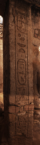 dritten Halle. Deutlich zu lesen sind hier noch die verschiedenen Kartuschen und Titulaturen des Königs Taharqa. Oben sein Thronname, darunter sein Geburtsname, es folgt sein Horusname (?). |