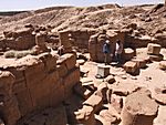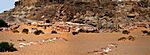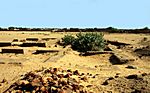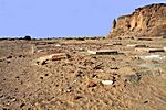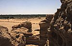 Blick über das Gelände am Gebel Barkal mit Ruinenresten von Tempel und Gebäuden