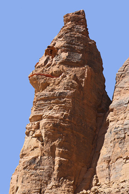 auf der südlichen Ecke der Klippe. Die auffällige Felsnadel galt möglicherweise als phallisches Symbol der regenerativen Macht Amuns. Vom Osten aus gesehen ähnelt die Felsnadel dem königlich-ägyptischen Uräus an der Weißen Krone. Vom Westen aus gesehen sieht die Felsnadel aus wie die mit der Sonnenscheibe gekrönte göttliche Schlange, dem Uräus. Nähere neuzeitliche Untersuchungen der Spitze dieser Felsnadel ergaben, daß diese bearbeitet wurde. An der freien Fläche (oben rechts im Bild zu sehen) fand man Reste von Bearbeitung, die Felswand war noch teilweise geglättet und ebenso fand man noch kleine Verputzreste. Es wird angenommen, daß dort auch Elektron (eine natürlich vorkommende Gold-Silber-Legierung) angebracht war (siehe Foto oben rechts). |