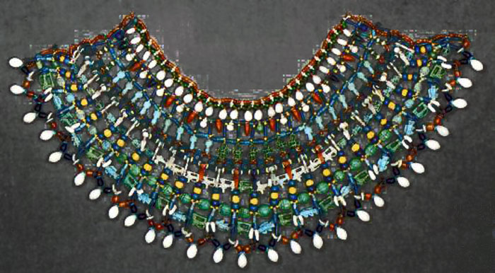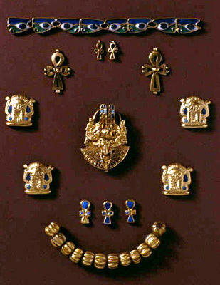 vollständig. Besonders hervorzuheben sind zwei Halskragen die aus Halbedelsteinen Fayence- und Glaselementen bestanden sowie zwei Bronzegefäße die griechische Importware gewesen waren. Heute sind diese Fundstücke fast vollständig im Ägyptischen Museum im Berlin ausgestellt. |