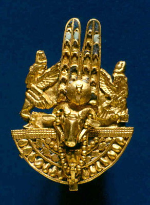trägt. Zwei geflügelte Göttinnen begleiten auf beiden Seiten diese Krone. Dieser Schmuck besteht aus Gold und Glasfluß. |