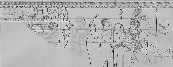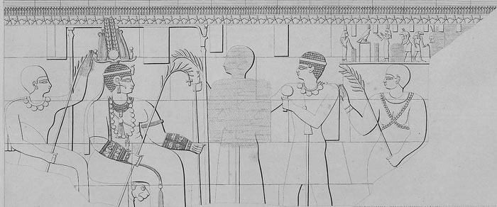 zerstört. Dort befand sich eine Scheintür. Auf der linken Wand ist von außen nach innen in sieben Register ein Trauerzug dargestellt, im oberen Register ein Schlitten mit Rollen. Vor der auf einem Löwenthron sitzenden Königin stehen Männer und Priester mit einem Palmwedel in der Hand, die andere Hand im Begrüßungsgestus erhoben und huldigen der Königin. Hinter hier steht wahrscheinlich ein Prinz mit einer Lotosblüte in der Hand. Die rechte Seite zeigt zwei Prinzen und eine Frau mit Palmwedel in der Hand vor der Königin, es folgen fünf Register mit Gottheiten. Hinter ihr sitzt wahrscheinlich auch ein Prinz mit einem Palmwedel in der Hand. |