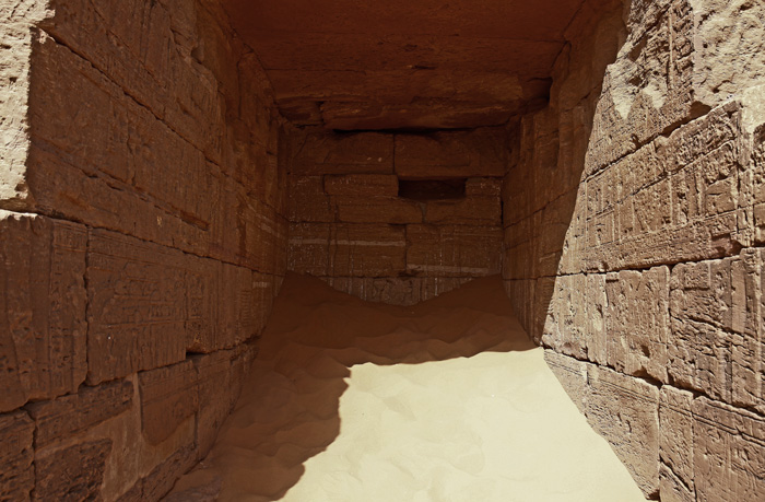 im Verehrungsgestus mit erhobenen Händen vor ihm. Der Ischedbaum war ein heiliger Baum, der vor allem in Ägypten verehrt wurde. Als Lebensbaum wurde ihm eine besondere Bedeutung zugeschrieben. Der Überlieferung nach sollen die Göttin Seschat und der Gott Thot auf den Blättern des Baumes die Regierungsjahre des amtierenden Pharaos geschrieben haben und dem König somit ewiges Leben geben. Im Unteren Register zum Eingang der Kapelle ist das Totenreich dargestellt mit der Apophisschlange, den größten Feind des Sonnengottes, die in der nächtlichen Reise des verstorben Königs abgewehrt werden mußte. |