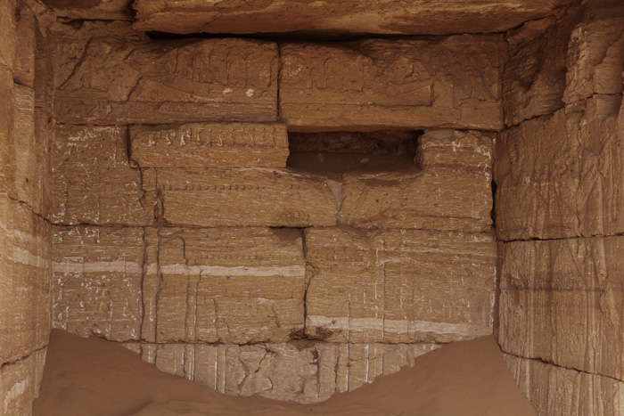 An der Rückwand der Kapelle befindet sich eine Scheintür. Hier sollen sich, nach Aussage von Porter & Moss, davor Statuetten von den Gottheiten Osiris, Isis und Nephthys befunden haben. Über der Scheintür ist noch deutlich ein Relief mit Darstellung der Barke des Re zu erkennen, auf welcher sich verschiedene Gottheiten und in der Mitte die beflügelte Sonnenscheibe befindet. | ||||