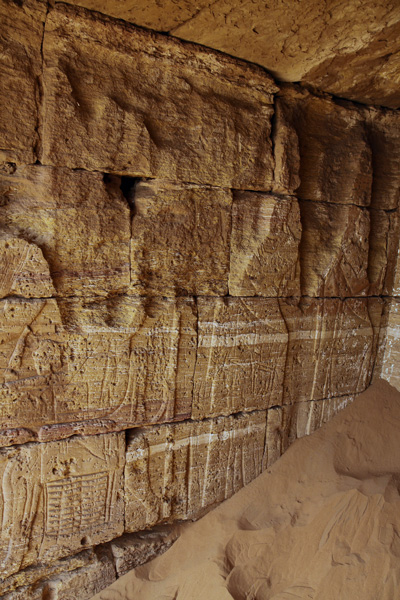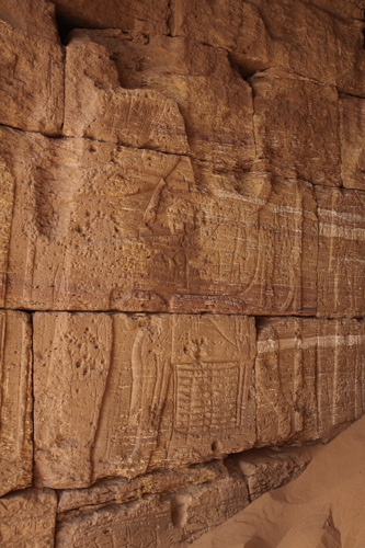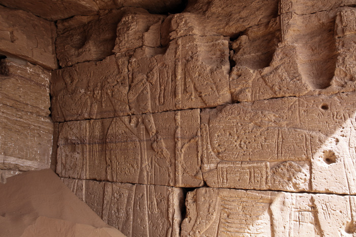 linken Kapellenwand ist folgendes zu sehen: Der König sitzt auf einem Löwenthron, hinter ihn seine Gemahlin mit einer Tochter, beide halten ein Sistrum in der Hand. Vor dem König sind verteilt in drei Register Priester mit Standarten dargestellt, die die heilige Barke tragen. Ebenso Priester die den Gottheiten Weihrauch und Trankopfer darbieten. |