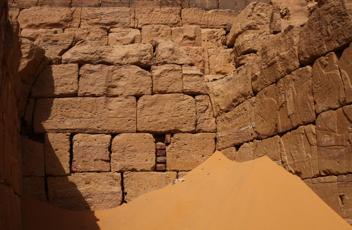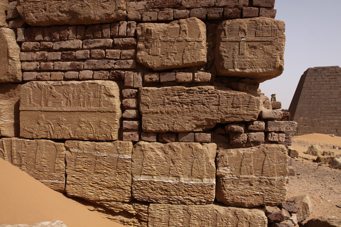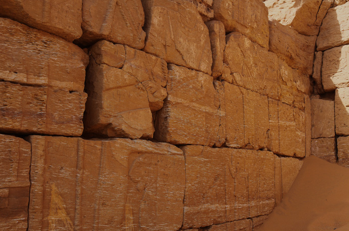 Auch hier ist die Wand ziemlich zerstört. Zu erkennen ist König/in auf einem Thron sitzend und vor ihm verschiedene Opferszenen. | |||