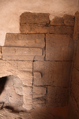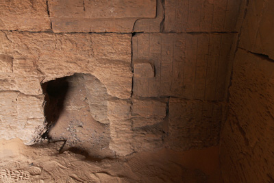 Auf der Rückwand, nur noch bruchstückhaft und schwer zu erkennen, sind Darstellungen auf denen der König Osiris und Isis Opfer darbringt. | |