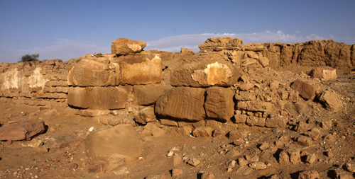 war der Wohnsitz der Königin Amanishakheto. Die Ruine eines Palastes der Königin, ca. 61 m im Quadrat groß, wurde 1959 bis 1960 ausgegraben, um den herum sich weitere Gebäude befanden. Der Palast hatte überwiegend eine Anzahl von langen Räumen und Korridoren, die wohl als Magazine benutzt wurden. Im Obergeschoß befanden sich die eigentlichen Wohnräume. Eine hier gefundene Inschrift lässt vermuten, das Amanishakheto (Ende des I. Jh. v. Chr.) diesen Palast erbaute. Der Palast gehört zu den größten meroitischen Profanbauten. Das aus überwiegend Lehmziegelmauerwerk errichtete Erdgeschoß hatte 60 Räume, diverse Eingangshallen und innere Rampen. Im Zentrum des Obergeschosses lag in Form eines Atriums ein Lichthof, um den sich weitere Räume gruppierten. Von hier fand man herabgestürzte Säulen und Kapitelle im Erdgeschoß. Zum Obergeschoß gelangte man über eine 21 m lange Repräsentationsrampe auf der Ostseite, die in das Atrium führte. Weitere Rampen im Inneren verbanden die Eingangshallen im Süden und Westen mit dem Obergeschoß. In einem durch Mauern geschützten Hofraum gelangte man durch ein westliches Portal. Der Hofraum verband wahrscheinlich die Residenz mit den beiden Tempeln. Im Osten lag etwas weiter entfernt ein kleiner Tempel und etwa 150 m weiter entfernt der Amun-Tempel. Die Architektur des Baus zeigt Einflüsse aus dem ptolemäisch-römischen Norden. |