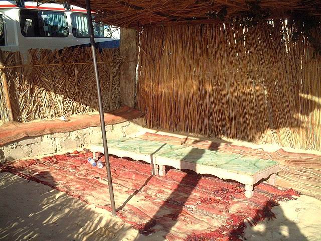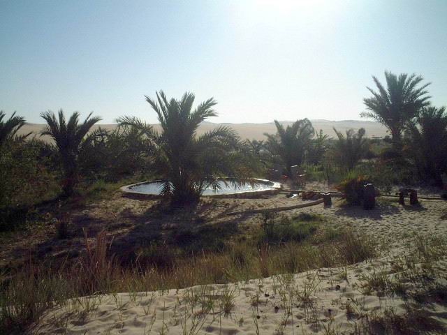 Danach ging es dann ohne Probleme weiter, bis wir am späten Nachmittag auf der kleinen Oase, welche unser Ziel war, ankamen. Nachdem wir uns frisch gemacht hatten und zur Entspannung in der warmen Quelle planschten, wurde unser Busfahrer aktiv und bereitete uns wieder ein tolles warmes Essen zu, daß wir gemütlich im Freien, unter einer Zeltplane zu uns nahmen ... und dann kam die Überraschung !!! | |||||
