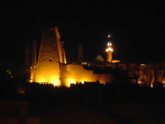 Blick von der Corniche (Uferpromenade des Nils) auf den nächtlich beleuchteten Luxortempel.