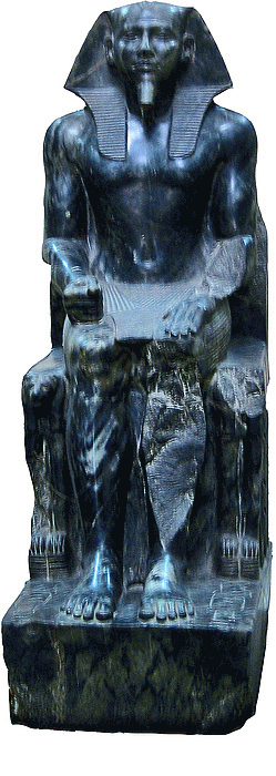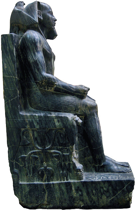 Chephren mit Horusfalke Material: Diorit; Höhe 168cm; Breite: 57 cm; Ägyptisches Museum Kairo. |