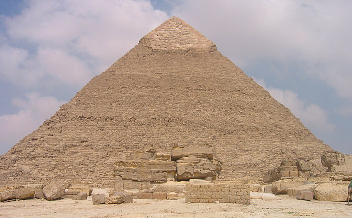 der Cheops-Pyramide. Besonders an der Spitze ist die Kalksteinverkleidung