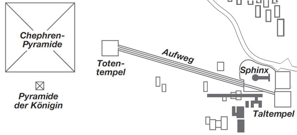 weiteren aus Tura-Kalkstein. Vom Architektonischen ist sie dem Bau seines großen Vorgängers ebenbürtig. Für das Gang- und Kammersystem wurde im Inneren eine völlig andere, dabei recht einfache Lösung gefunden. Durch eine Planänderung hat die Pyramide zwei Eingänge. Beide liegen auf der Nordseite. Der heutige Zugang liegt etwa 3 Meter außerhalb des Bauwerks. Von diesem führt ein Gang schräg nach unten, von dem westlich ein Raum abzweigt. Der jüngere Eingang liegt in etwa zwölf Meter Höhe an der Nordwand. Von dort aus führt zunächst ein Gang nach unten, der dann auf Höhe der Pyramidenbasis horizontal verläuft und sich dann mit dem unteren Gang vereinigt. Dieser Gang führt waagerecht in die mit einem Giebeldach ausgestattete Grabkammer und hat den Grundriß von 14,1 x 5 m. Die Grabkammer liegt zentral am Boden der Pyramide. In der Neuzeit betrat erstmals 1813 G. Belzoni die Grabkammer. Er fand den leeren Sarkophag des Königs. Der Sarkophag besteht aus schwarzem Hartgranit und ist halb in das sehr dicke Pflaster eingelassen, das früher mehr vom Fußboden bedeckt war. Der Deckel lag in zwei Teile zerbrochen daneben. Eine Grube in der Pyramide, die erste ihrer Art in einer Pyramide gefundene, barg wahrscheinlich die Kanopentruhe, welche mit ihrem Deckel mit dem Bodenniveau abgeschlossen hätte. Der im Vergleich zur Cheops Pyramide geringe Raumumfang ließ vermuten, daß noch weitere Kammern dort sein könnten. Eine strahlentechnische Untersuchung blieb jedoch ergebnislos. Eine kleine Nebenpyramide befand sich auf der Südseite der Großen Pyramide. Hiervon ist fast nichts mehr erhalten, sogenannte Steinräuber haben sie fast völlig beseitigt. Zu sehen sind noch ein paar Fundamentgrundrisse sowie ein paar Steinquader. Es wird vermutet, daß sie der die Beisetzung der ka-Statuen diente. Von ihren zwei abgehenden Passagen mündet eine unter der großen Pyramide und endet in einer Sackgasse in einer kleinen Nische. Hier fand man Teile einer Holzkiste mit ehemaligen Möbelstücken. Diese wurden von Ahmed Youssef zusammengebaut und ergab ein Zedernholzrahmen in Form einer Gotteskabine (sah netjer), die wahrscheinlich aus rituellen Gründen in gleichmäßige Stücke zerhackt war. Bekannt sind solche Gotteskabinen z. B. aus Grabszenen der Cheops Enkelin Meresanch, worauf zu sehen ist, wie eine Gotteskabine (sah netjer) mit einer Statue des oder der Verstorbenen darin rituell zum Grab gezogen wird. |