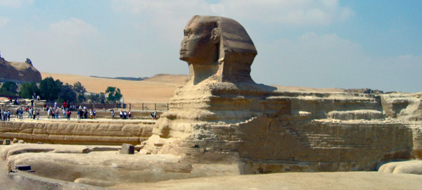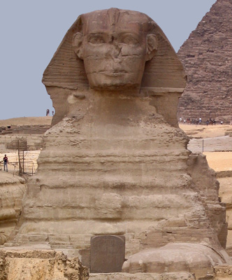 Sphinx Am unteren Ende des Aufwegs befindet sich der 20 m hohe aus gewachsenem Felsgrund gehauene löwengestaltige mit menschlichen Kopf versehene Sphinx. Sein Antlitz soll Chephrens Züge tragen. Auf der "Traumstele" des Thutmosis III., die sich zwischen den Füßen befindet und von Thutmosis III. in der 18. Dynastie dort aufgestellt wurde, ist zu lesen: "@aj=f-[Ra] tw.t jr n Itm-Ra-@r-m-Ax.t"... Chephren, das Abbild, das für Atum-Re-Harmachis [= Sphinx] gemacht wurde ...". Das spricht dafür, daß die Ägypter des Neuen Reiches den Sphinx als Abbild des Chephren gesehen haben könnten. Allerdings ist das bereits eine Zeit, die etwa 1000 Jahre nach der Erstellung liegt, also auch nicht mehr unbedingt als zeitgenössisch gelten kann. Zudem ist der Text an dieser Stelle leider unvollständig. ..."(1) Die Figur des Löwen symbolisierte in mehreren antiken Nahostkulturen die Sonne wie zugleich auch die Königswürde. Die Gestalt lebte in der ägyptischen Ikonographie zweieinhalb Jahrtausende fort und wurde zum Vorbild zahlloser Nachahmungen. Der Löwenkörper der Sphinx ist in seiner Dimension zu groß. Man vermutet, daß die Erbauer den Körper verlängerten, um eine fehlerhafte Gesteinsschicht zu überbrücken. Wie schon erwähnt, befindet sich der Sphinx am unteren Ende des Aufwegs. Verlängert man die rechteckige Zweitumfassungsmauer des Pyramidenkomplexes nach Osten, so wäre der Sphinx in diesem Komplex mit eingeschlossen. Die Südseite des Sphinxgraben bildet so den Nordrand des Aufwegs. Durch diese enge Verbundenheit geht man davon aus, daß der Sphinx für Chephren geschaffen wurde. Untersuchungen haben ergeben, daß der Sphinx aus verschiedenen Gesteinsschichten geologischer Epochen entstammt und aus diesem Grund die Figur auch unterschiedlich erhalten geblieben ist. Der relativ gut erhaltende Kopf besteht aus hartem Fels, der Leib aus weichem Stein, die Füße aus Hartsand und Korallenriff. Die Steinblöcke, die beim Herausarbeiten der Sphinx entstanden, wurden für den Sphinx- und Taltempel benutzt. Der Sphinxtempel wurde z. B. aus diesen Kernblöcken errichtet, ersichtlich an ihren weichen gelben Streifen zwischen zwei harten Lagen, welche knapp unterhalb der Brusthöhe des Sphinxleibes entnommen wurden. Vor der Sphinx steht der Sphinx-Tempel. Er liegt etwa 2,5m tiefer als die Sphinxterrasse und ist in die erste Schicht des Felsen gehauen. Welchem Zweck er diente, ist unbekannt. Es gibt keine schriftlichen Hinweise auf dieses nie vollendete Bauwerk. Der Tempel hat ebenfalls einen einen zentralen Innenhof mit mit 24 Säulen aus Rosengranit, die eine Kolonnade und einen Wandelgang bilden, an dessen Seiten 10 große Königsstatuen stehen. Bereits während der Antike wurde die Figur mehrfach restauriert, was durch Arbeiten belegt werden kann, die Thutmosis IV. (18. Dynastie) ausführen lies. Spätere Pharaonen suchten diesen Ort auf, um ihre Macht zu legitimieren. Amenhotep II. ließ hier einen weiteren Tempel errichten, Tutanchamun erbaute ein Rasthaus. Zahlreiche gefundene Stelen aus späterer Zeit belegen die kulturelle Bedeutung dieses Ortes auch in den folgenden Dynastien. |