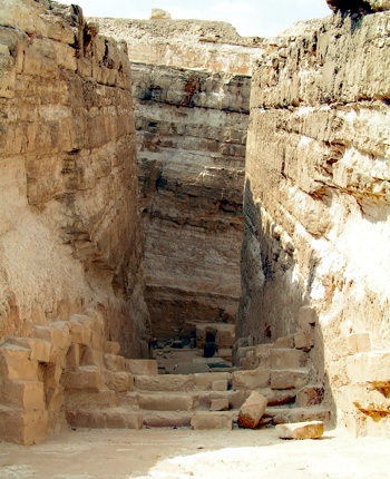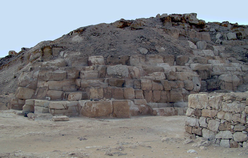 Im Gegensatz zur neueren Bauweise, zuerst seine Pyramide zu erbauen und anschließend seine Totenkammer ins Fundament meißeln zu lassen. Schacht und Grabkammern bestehen aus großen Blöcken aus Assuangranit, der wahrscheinlich auch für die unteren Lagen der Pyramidenverkleidung Verwendung fand. | |