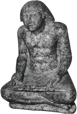Französische Grabungen 1907 in Abu Roasch förderten einen sehr gut gearbeiteten Kopf aus Rosenquarzit zutage, der Djedefre mit nemes-Kopftuch zeigt (siehe Bild oben), sowie eine Statuette seines Sohnes in Gestalt eines Schreibers im traditionellen Lotussitz (siehe Bild oben) und die untere Hälfte einer Doppelstatue des Königs mit seiner Frau. Alle drei Funde befinden sich im Louvre Museum. |