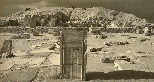 der Tür zu ihrem Tempel und einem kleinen Obelisken. Nachdem noch eine beschriftete Stele mit dem Namen Merititjes, Frau und Tochter eines Königs gefunden wurde, vermuten die Franzosen, daß es noch mehr Pyramiden dort geben könnten. Es wurde später noch eine 5. Pyramide entdeckt, was dafür sprechen würde. |