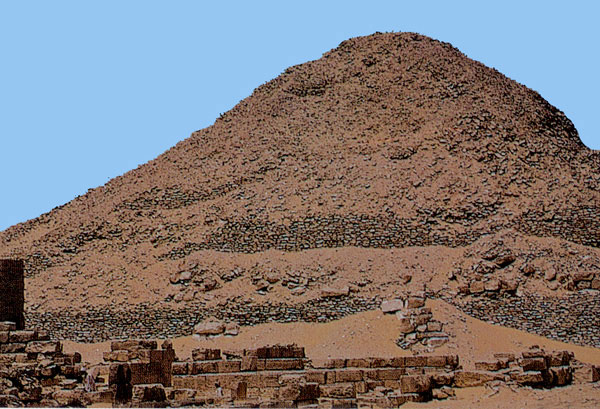 Neigungswinkel von 53°7'48''. Als zwischen 1926 und 1936 Gustave Jequier sie ausgrub, fand er nur noch einen niedrigen Hügel vor. Der Kern der Pyramide bestand aus fünf Stufen, die Haltemauern aus kleinen unregelmäßigen Tafla- und Nilschlammsteinen. Verkleidet war das Ganze mit schweren Tura-Kalksteinblöcken. Einmalig an dieser Pyramide ist ein nachträglich angefügter mächtiger Gürtel von 6,5m. Dieser Gürtel wird interpretiert, daß der Baumeister mit einem Band um den Sockel das Aussehen der Hieroglyphe "Pyramide" wieder geben wollte, oder er sei um die Baufestigkeit besorgt gewesen und verstärkte hiermit die Pyramide. Zumindest ist diese Bauweise in der 6. Dynastie selten anzutreffen. Vom Eingang führt ein Gang zu einer Korridorkammer mit einer von Sternen bedeckten Decke und Pyramidentext beschriebene Wand. Hier wurden Alabaster- und Dioritvasen, die vielleicht Parfüm enthielten, gefunden. Ebenso Goldspatel, die wahrscheinlich in einem Ritual zum Verschließen des Pyramidenkorridors dienten. Die weitere granitverkleidete Horizontalpassage war von drei Fallsperren blockiert. Die Innenkammern besaßen ebenso ein mit Sternen verziertes Giebeldach, Nord- und Südwand bestand aus einem einzigen Kalksteinquader. Um den mit den Königstiteln verzierten Sarkophag aus schwarzen Granit waren die Wände mit einem Nischenmuster der heiligen Schilfsmattenkabine versehen. Am Kopf- und Fußende zeigte ein Dekor grün bemalte Scheintüren, darüber die Namenspalette des Königs. Westlich der Sarggrube lag auf zwei niedrigen Mauern der Sargdeckel. Nur die Nische der Kanopentruhe im Fußboden und deren Granitdeckel sind heute noch übrig. |