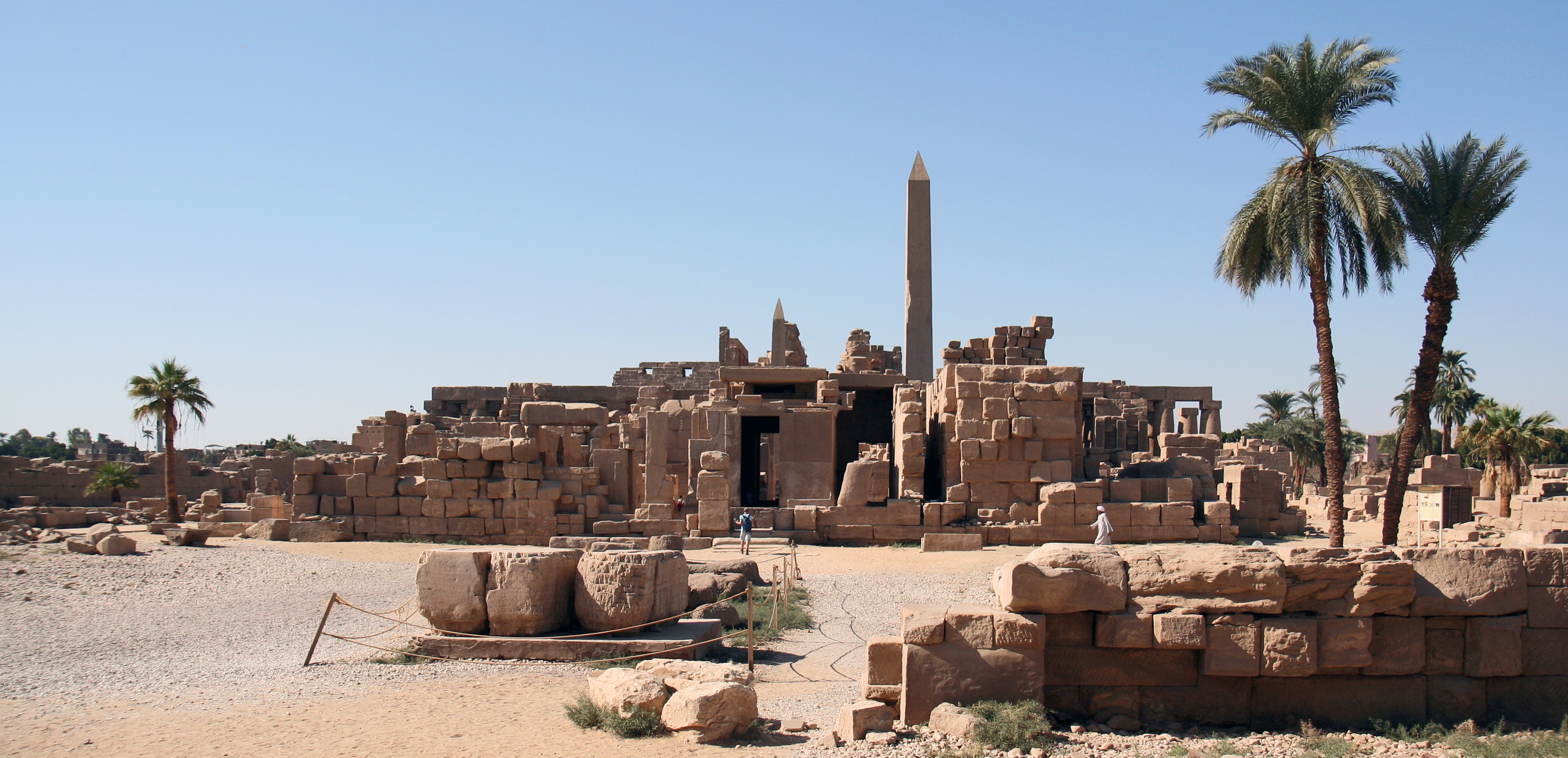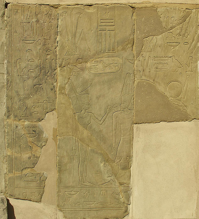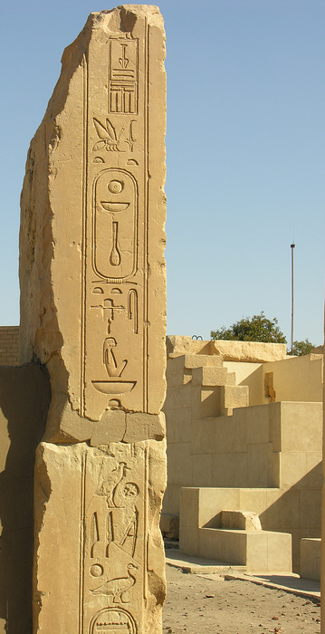 nb-H³pt-R' "Herr des Ruders, ein Re", links auf dem Foto: Mntw-Htp(w) "Month ist gnädig". Am Satettempel, der schon seit der frühen 6. Dynastie ein Heiligtum war, führte Mentuhotep Nebhepetre umfassende und erneuernde Bautätigkeiten aus. Das so neu errichtete Heiligtum, welches den umliegenden Bauten angeglichen wurde, ist auf einem etwa 2,50 Meter höherem Niveau angelegt. |