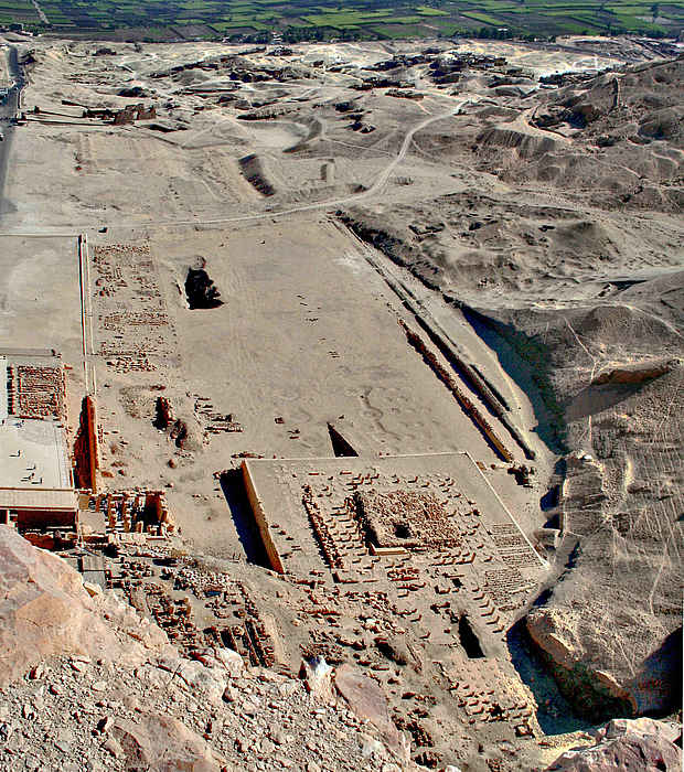 Tempels der Königin Hatschepsut und links unten des späteren Tempels von Thutmosis