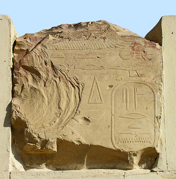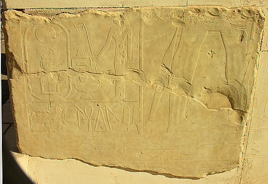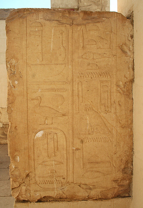 war. In ihm ruhte im Mittleren Reich das Götterbild des Amu-Re. Auf der Vorderseite sind Inschriftreste erhalten, aus denen sich die Datierung dieses Blockes ergibt. Es ist der Name des Königs zu erkennen. Eine ältere Tempelanlage des Amun aus den Anfängen des Mittleren Reiches überbaute Sesostris I., wie der Fund einer großen steinernen Plattform im Boden zeigt (siehe oben rechts auf dem Bild). |
