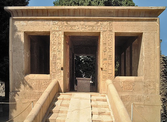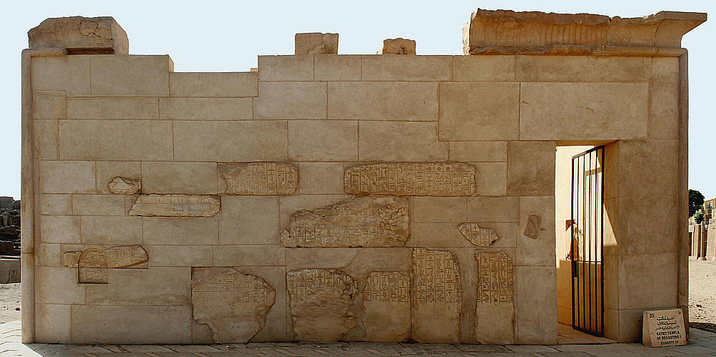 Sesostris I. errichtet und war dem Amun geweiht. Vor einer im Kiosk aufgestellten Statue des Amun wurde der König geführt und somit die schon vorher von Horus und Thot durchgeführte Krönung durch ein erneutes Aufsetzen der Krone und durch Handauflegen durch Amun bestätigt. Thot verkündet gleichzeitig das Ereignis nach allen vier Himmelsrichtungen. Inschriften und Darstellungen des Oberbaues berichten von dieser Neukrönung des Königs. |