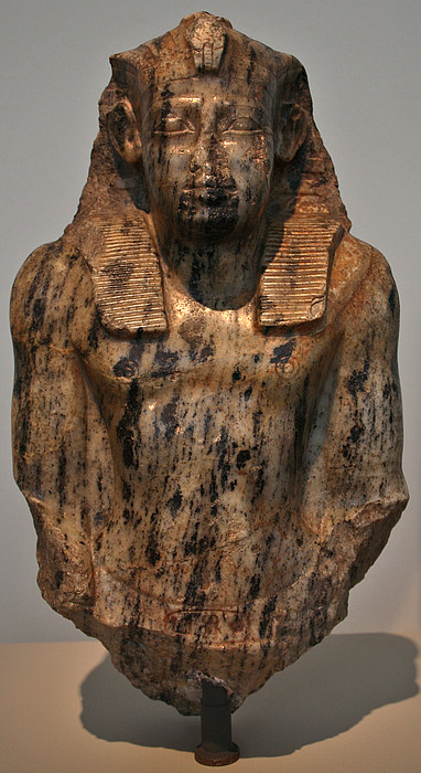 Pyramidenkomplex errichten. Dieser liegt etwa 2 km südlich der Pyramidenanlage seines Vaters bei Lischt. Die Pyramide trug den Namen "Sesostris-petri-taui", was soviel heißt wie "Sesostris blickt auf die Beiden Länder". Der nach dem Vorbild des Alten Reichs angelegte Pyramidenbezirk besaß einen gedeckten und dekorierten Aufweg, ein Vestibül sowie einen Verehrungs- und Totenopfertempel und eine Kultpyramide. Überlebensgroße Sitzstauen des Königs aus bemalten Kalkstein umstanden den offenen Innenhof des Totentempels. Auch diese Statuen waren im Stil des Alten Reiches hergestellt. Heute befinden sich 10 Statuen davon im Ägyptischen Museum Kairo. |