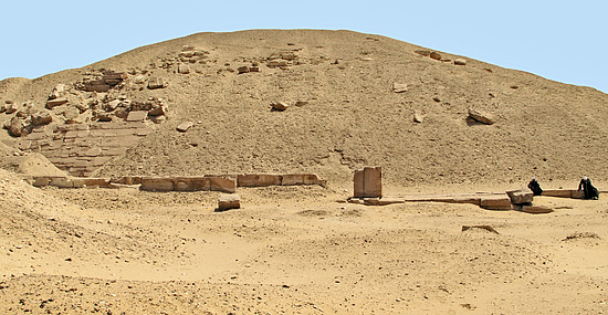 verkleidet war. Ein über Jahrhunderte währender Steinraub setzte diesem Bauwerk stark zu. Dadurch erfolgte eine nahezu gänzliche Freilegung des Mauerkerns. Es wurden bei archäologischen Untersuchungen an mehreren dieser Kernblöcke Kontrollmarken der antiken Handwerker gefunden. Daraus konnte als frühestes Datum der Bautätigkeit auf das 10., als spätestes Datum auf das 24. Regierungsjahr des Pharaos geschlossen werden. So wird eine ungefähr 14 bis 15 Jahre dauernde Bautätigkeit angenommen. Die Grabkammer im Inneren der Pyramide ist nie freigelegt worden und heute vom Grundwasser überflutet. Neun Pyramidengräber von Königinnen und Prinzessinnen, unter anderem das Grab der Nofru, befinden sich um die Pyramide. |