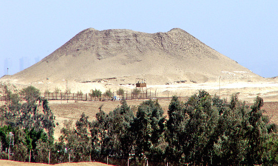 Sesostris III. ließ sich bei Dahschur seine Pyramide errichten. Sie liegt nordöstlich der roten Pyramide vom Pharao Snofru. Die Pyramide war aus Lehmziegeln errichtet, unter Verzicht auf das Steingerippe, wie es bei den Vorgängerbauten üblich war. Sie besaß ursprünglich eine Verkleidung aus feinem Turakalkstein, die durch Krampen mit dem Pyramidenkern verbunden wurde. Auf dem aus drei Lagen Lehmziegel bestehenden Fundament verlegte man grob gehauene Blöcke aus Kalkstein. Darauf kamen unterschiedlich große Lehmziegel, horizontal in Stufen verlegt. Die Fugen wurden ohne Mörtel, sondern nur mit Sand verfüllt. Die Höhe betrug ursprünglich etwa 78 m, die Seitenlänge der Basis 105 m bei einem Neigungswinkel von ca. 56°. Heute ist die Pyramide stark verfallen und ihre Kalksteinverkleidung verloren gegangen. |