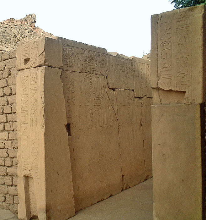 Dort ließ Sesostris III. den ersten Tempel, der bereits seit dem Alten Reich ein Heiligtum des Kriegsgottes Month war, mit einem eigenen Tempel überbauen. Dieser Tempel hatte einen Grundriß von etwa 60/65 × 100 m. Er war von Nord nach Süd ausgerichtet und wurde aus Lehmziegeln errichtet. Nur die Türdurchgänge und Säulen einschließlich der Architrave bestanden aus Kalkstein. Der Eingang befand sich im Norden. Zwei Tore konnten aus den vorgefundenen Fragmenten rekonstruiert werden. Das eine Tor, das sogenannte Sedfest-Portal, was an das Krönungsjubiläum von Sesostris III. erinnert, befindet sich heute im Ägyptischen Museum Kairo, das zweite Portal im Südwestteil des Freilichtmuseums im Tempel von Karnak (siehe Foto). Hier wurden auch zahlreiche Statuen gefunden. |