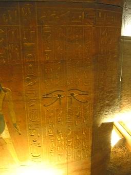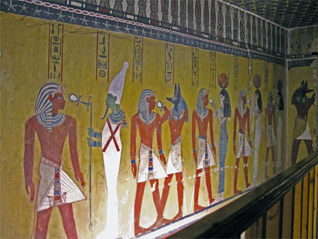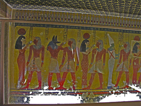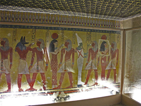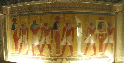Erstmals auf einem kräftigen goldgelben Hintergrund werden Götterszenen und Figuren wiedergegeben. Zu sehen ist auch wie Thutmosis IV. von den Totengöttern Osiris, Anubis und Hathor, welche ihm als Geschenk das Zeichen des Lebens, das Anch-Zeichen, vor das Gesicht halten. Bis auf kleine Unterschiede in der Kleidung der Gottheiten sind die Darstellungen der Personen identisch, auch die Inschriften ähneln sich sehr. Sie enthalten nur die Namen dieser Gottheiten und den Thron- und Geburtsnamen des Königs. |
