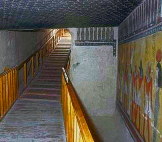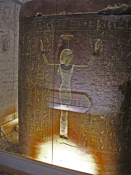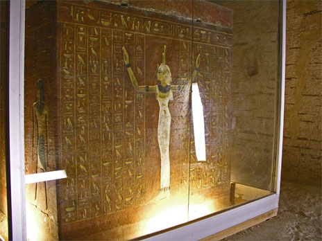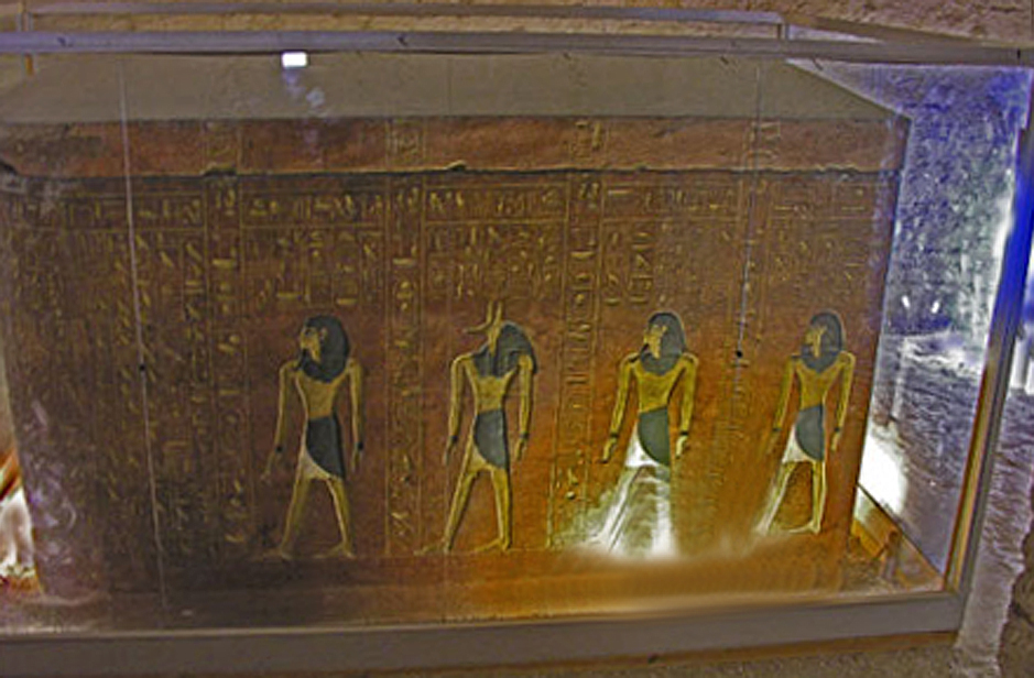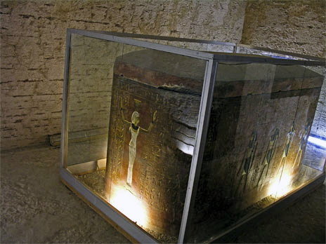 Diesen herrlichen Quarzitsarkophag fand man bei der Entdeckung des Grabes. Er hat eine Länge von 3 Metern und eine Breite von 1,60 Meter und steht noch an seinem ursprünglichen Platz. Das Material für den Sarkophag stammt aus den Steinbrüchen bei Heliopolis, der alten Stadt des Sonnenkultes und beruht auf einer in der frühen 18. Dynastie engen Verbindung zum Sonnenkult. |