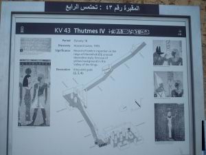 Thutmosis IV., dessen Grab Howard Carter am 18. Januar 1903 entdeckte, regierte von 1400 bis 1390 v. Chr.. Außer den königlichen Grabbeilagen barg Carter verschiedene Fragmente von drei Nebenbestattungen, vermutlich Kinder von Thutmosis, welche schon vor ihm verstorben waren. Es wird vermutet, daß es Fragmente von seinem Sohn Amen-Em-Het, seiner Königstochter Tentamun sowie die Mumie einer Person sind, deren Name nicht bekannt ist. Die Mumie von Thutmosis fand man in einer Nebenkammer im Grab Amen Hotep II., diese Mumie befand sich dort in einem schmucklosen grob hergestellten Ersatzsarg aus späterer Zeit. |