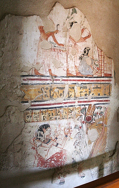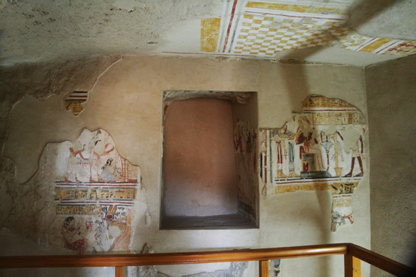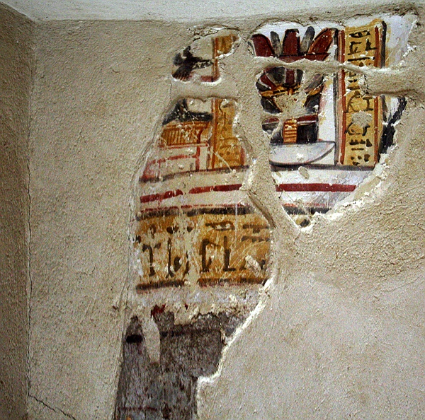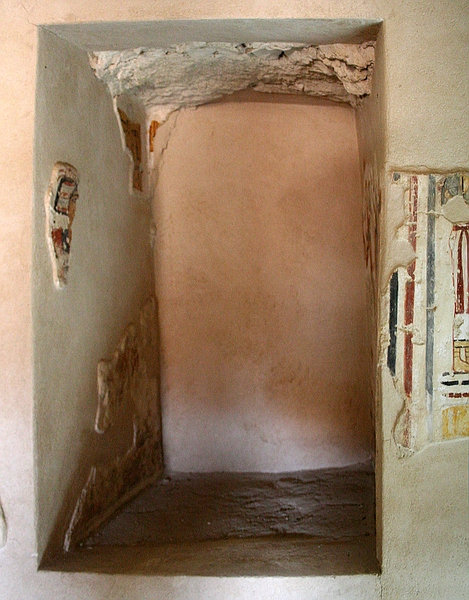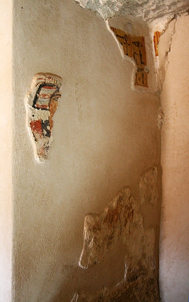 Ostwand befindet sich in etwa zentriert eine Nische. Wie auf den Fotos zu erkennen, ist die Dekoration nur bruchstückhaft erhalten geblieben. Möglich ist, daß dort eine kleine Statue des Grabinhabers stand. Auch hier deutlich zu sehen, daß nur ein kleiner Teil der Deckendekoration erhalten blieb. |