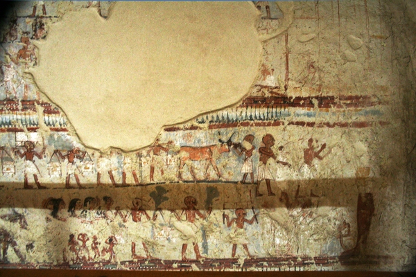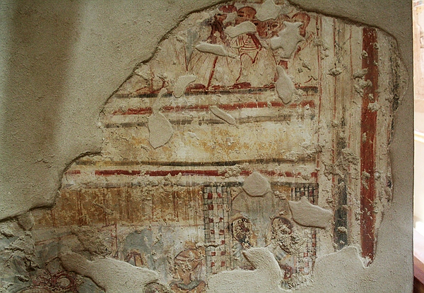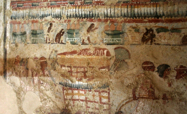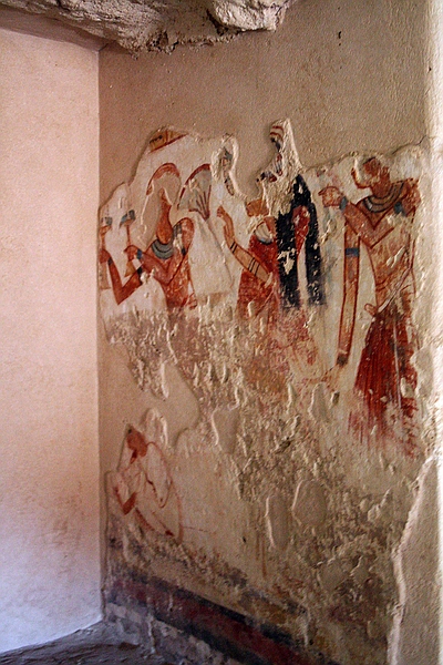 weiter Richtung Tür befindet sich diese Reste der Dekoration. Im oberen Teil ist eine Gruppe von Priester mit glatt rasiertem Köpfen zu erkennen. Einer davon hält eine große Vase in der Hand.