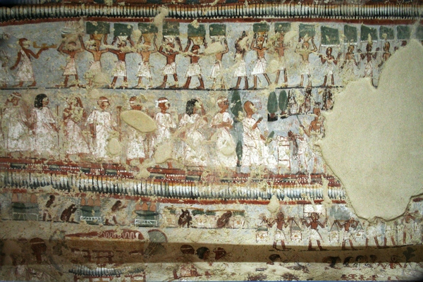 Ausschnitt der Prozession des Beerdigungsritual. Im oberen Register tragen männliche Opferträger bemalte Kisten und diverses Gemüse zum Grab. Darunter im zweiten Register näher sich Schuroy mit festlich gekleideten Verwandten einem Garten. Das dritte Register zeigt den Transport verschiedener Möbelstücke und andere Grabbeigaben zum Grab gebracht werden. Dazwischen kauern einzelne Träger und ruhen sich kurz aus.