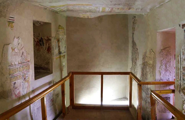 Richtung Nord-Ostwand. An der Ostwand befand sich der ursprüngliche Zugang zum Grab. Die Kammer besitzt eine unregelmäßige Rechteckform. Die Dekoration der zweiten Kammer ist zum größten Teil zerstört oder auch unvollendet geblieben.