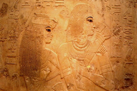 Ramose und seine Frau Meritptah, eine wunderschöne Reliefdarstellung in Kalkstein geritzt und nur die Augen ausdrucksvoll angemalt.