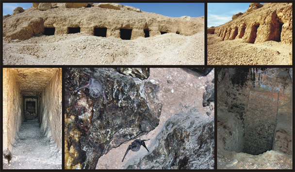 Gräbern zu dieser Zeit. Allerdings datiert sie den Schacht (hier nicht abgebildet), der im Vorhof liegt in die 17. /18. Dynastie, Aufgrund ähnlicher Schächte in diesem Zeitraum. Die Pfeiler haben etwa eine Frontbreite von 2m und Tiefe von 3,20m, die Gangbreite des Portikus hinter den Pfeilern beträgt etwa 2,30m (siehe Foto oben rechts). Auf Grund von fehlenden Inschriften, ist es nicht möglich, den Grabinhaber zu benennen. Etwa nach einem Drittel (zwischen 4-5 Pfeiler von rechts) führt ein längerer Korridor in den Berg, an dem am hinteren Ende ein sehr tiefer Schacht mittig sich befindet. Auch an der hinteren Schachtwand sind noch Farbreste zu erkennen. |